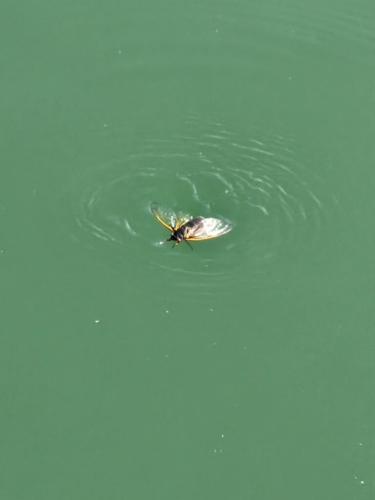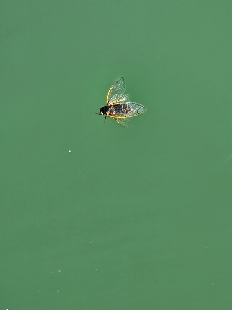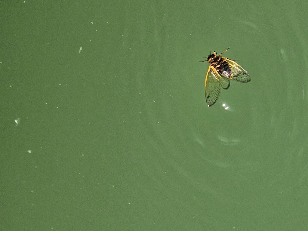 Pollen white puffs and cicadas coat the water
