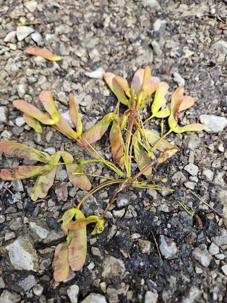 A couple early helicopters sprinkled on forest floor