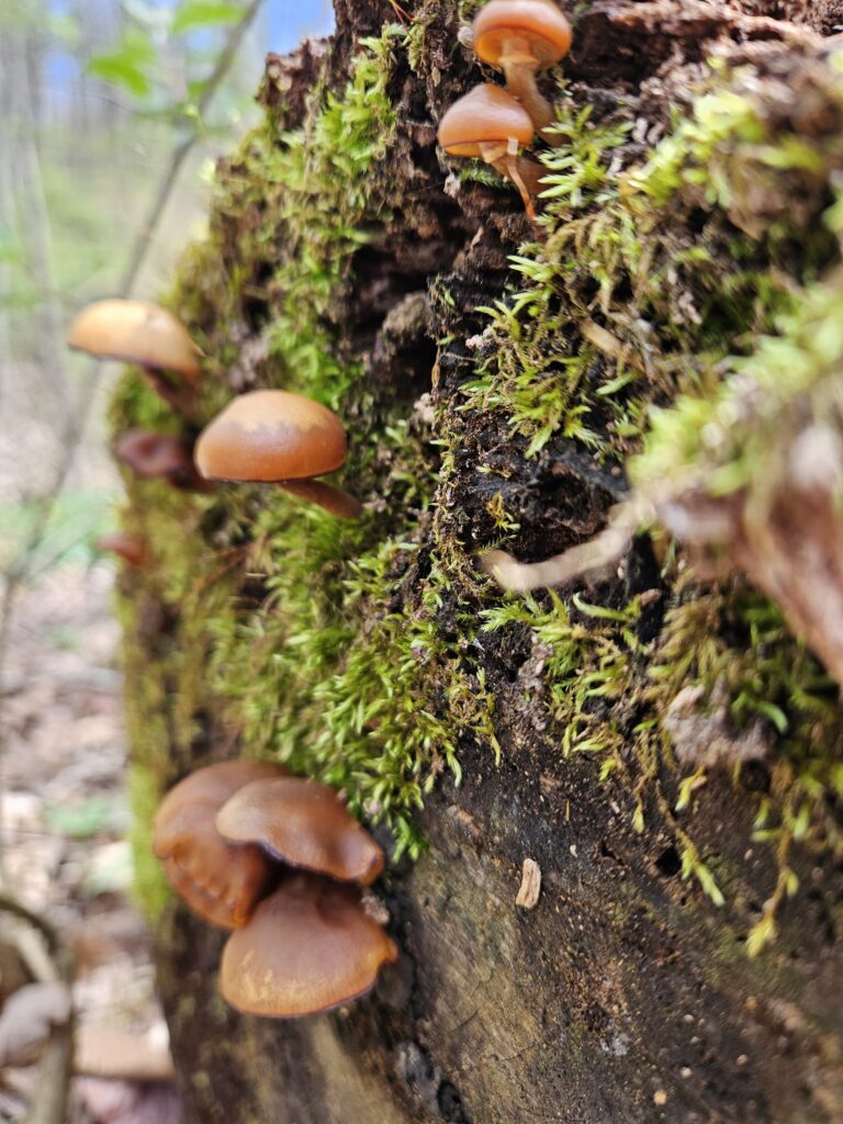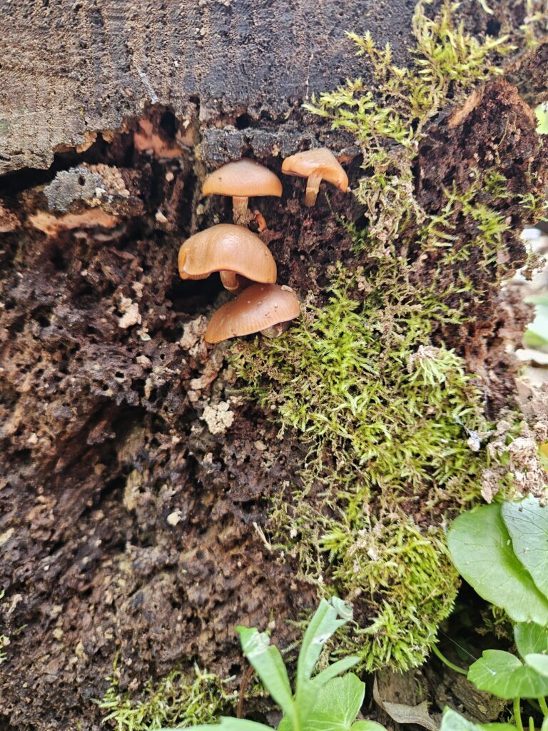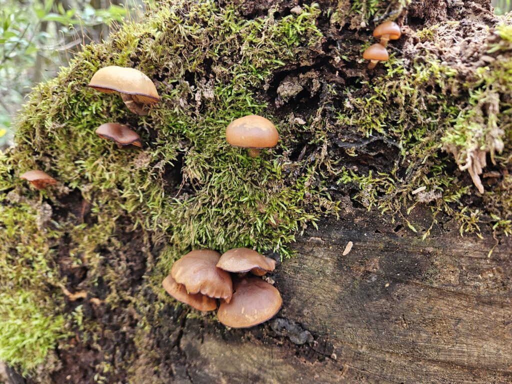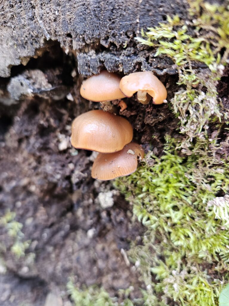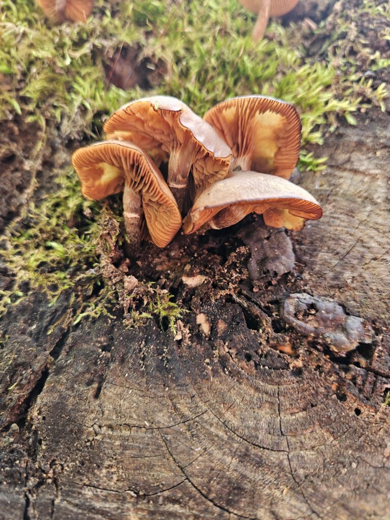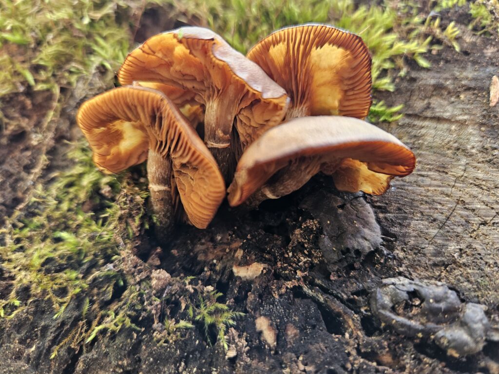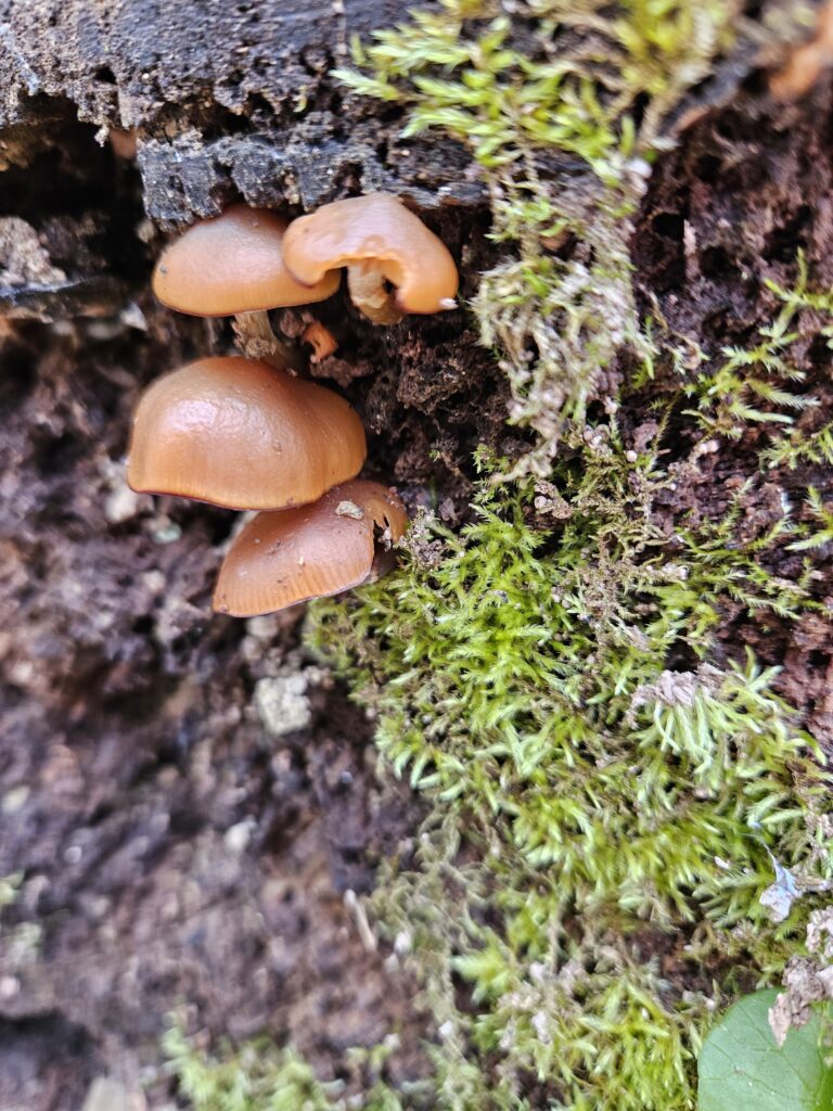 Sweet orange chestnut mushrooms sprouting from the Moss
